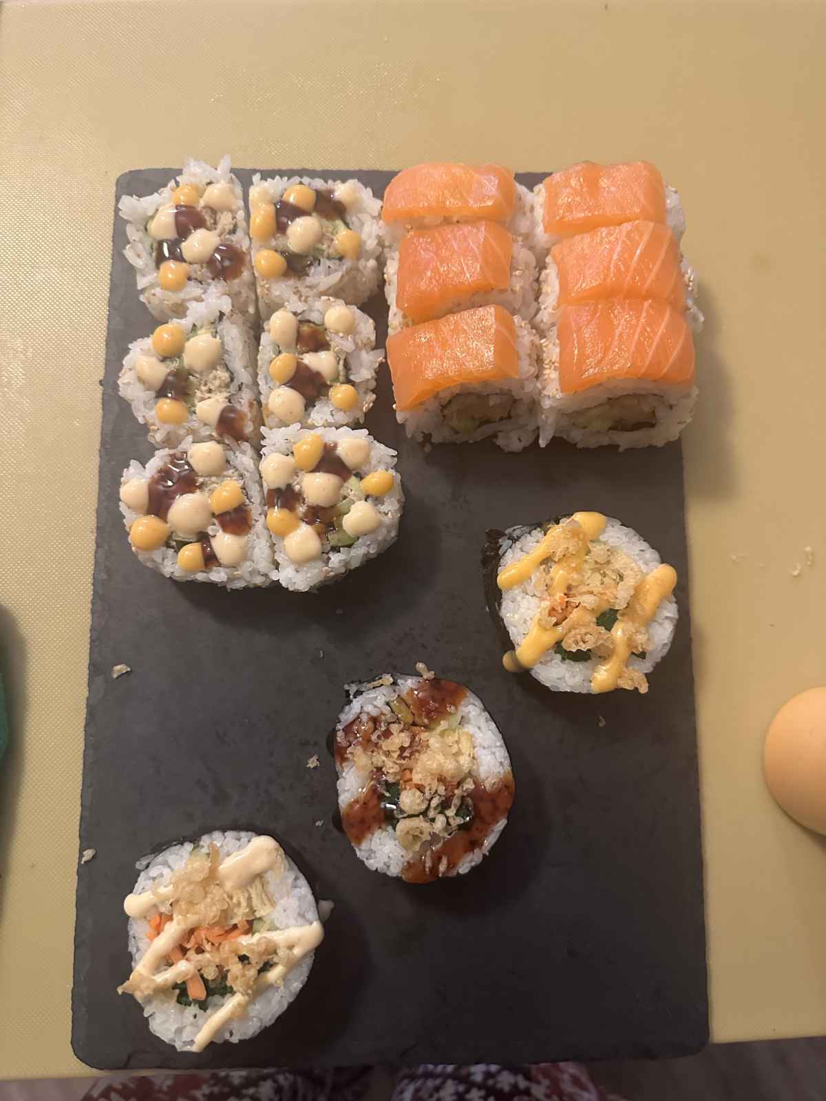 With torched salmon, spicy tempura salmon and avocado