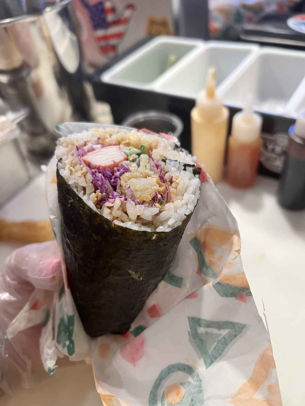 With chicken, onions, broccoli, pineapple, red peppers and orange sauce