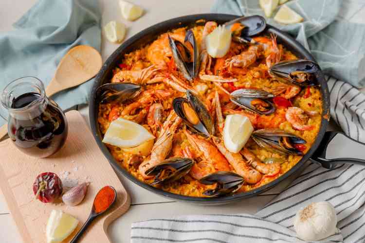 Today, paella comes in many variations. Seafood paella is made with a variety of fresh seafood like mussels, shrimp, clams and sometimes squid. However, the classic Valencian dish known as paella Valenciana remains the most authentic. It’s traditionally made with chicken, rabbit and sometimes snails, along with local beans and saffron.